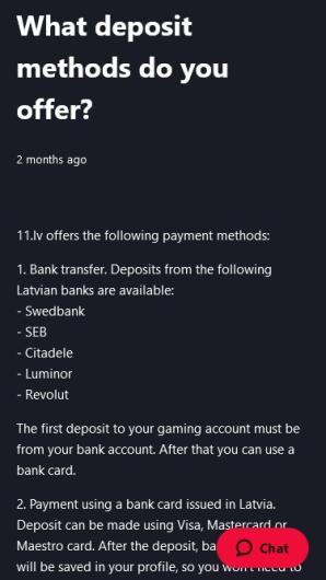 The biggest advantage of playing at 11.LV is definitely the availability of local payment methods. As a Latvian player, you may deposit and withdraw fast, using over 20 popular payment options. There you will find credit and debit cards, e-wallets, and bank transfers. Local payment methods include Swedbank, SEB, Citadele, Luminor, Visa, Mastercard, Maestro, Brite, and Revolut.