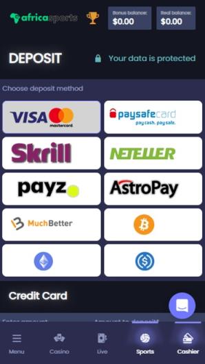 Starting your journey at AfricaSports Casino is quick and effortless with this simple, single-step registration. To sign up, find the shortcut conveniently located in the lower right corner of the page. You only need to provide the amount you are willing to deposit and to select the payment method you are going to do it with. When returning to the site, simply locate the ‘log in’ button in the upper right corner, submit your email and password, and gain immediate access to your profile.