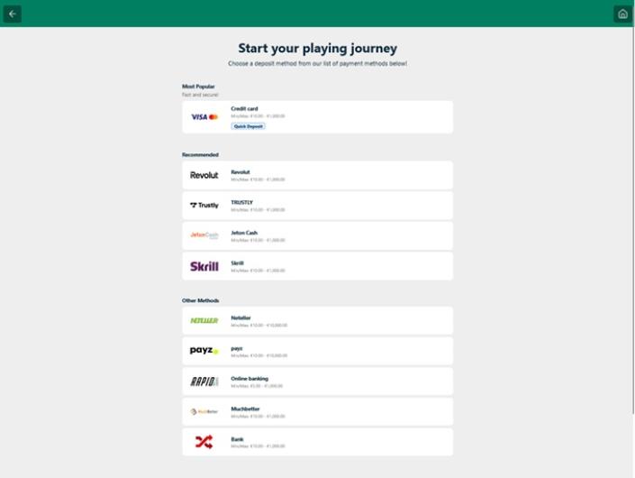 - The minimum and maximum deposit amounts depend on the chosen payment method.