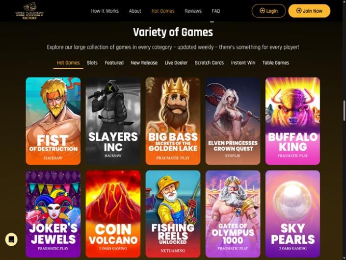 Promising to offer a safe, secure, and thrilling online gaming experience, The Money Factory invites players to check out its platform and enjoy exploring amazing games. Collaborating with the industry’s most creative minds such as Hacksaw Gaming, Pragmatic Play, and 3 Oaks Gaming, it accommodates an impressive selection of slot releases, table games, and live dealer games.
