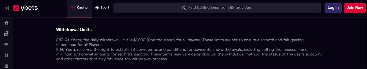 While the funds were restored, new issues related to withdrawal policies emerged. Ybets imposes a daily withdrawal limit of 1,000 USDT and allows only three pending withdrawals at a time.