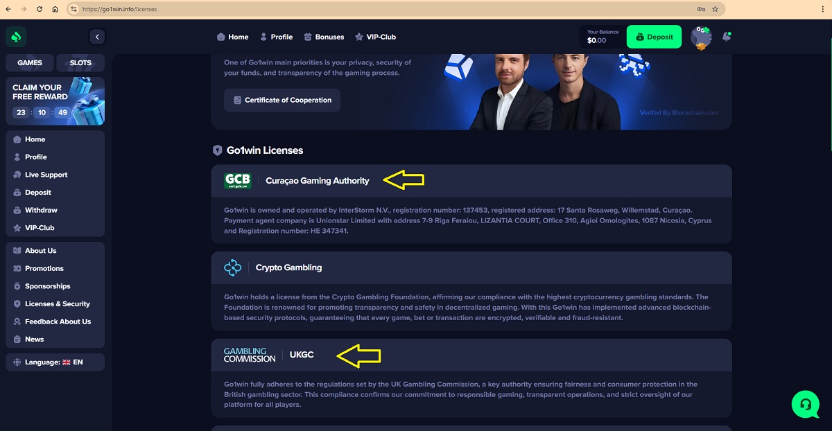 On its website, go1win.info claims regulation by both the Curaçao Gaming Authority and the UK Gambling Commission. We verified both statements and found them to be false.
