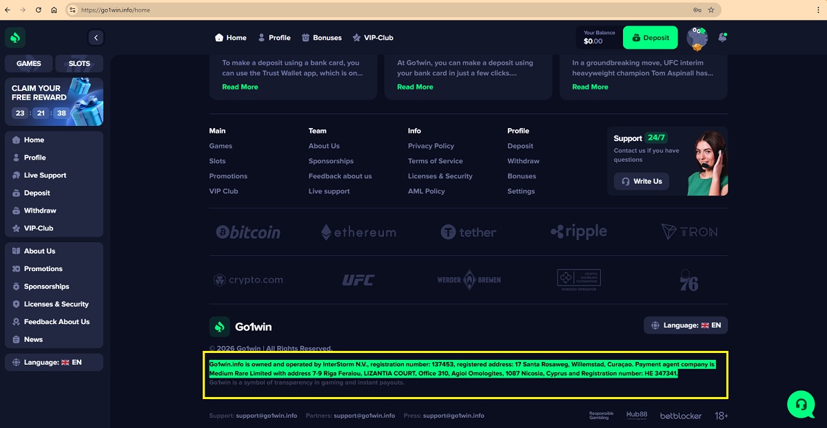 "go1win.info is owned and operated by InterStorm N.V., registration number: 137453, registered address: 17 Santa Rosaweg, Willemstad, Curaçao. Payment agent company is Medium Rare Limited with address 7-9 Riga Feraiou, LIZANTIA COURT, Office 310, Agioi Omologites, 1087 Nicosia, Cyprus and Registration number: HE 347341."