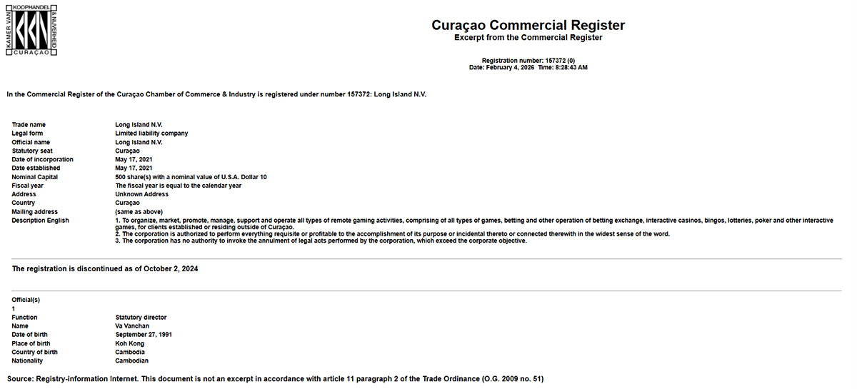 Long Island N.V., named in the Terms and Conditions, shows its own problems. The Curaçao Chamber of Commerce lists the company as discontinued as of October 2, 2024. This means neither entity presented as the operator can legally run a casino.
