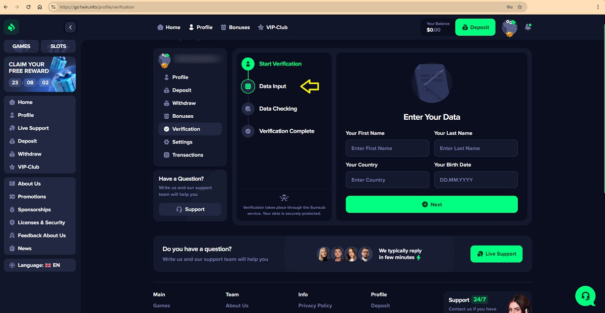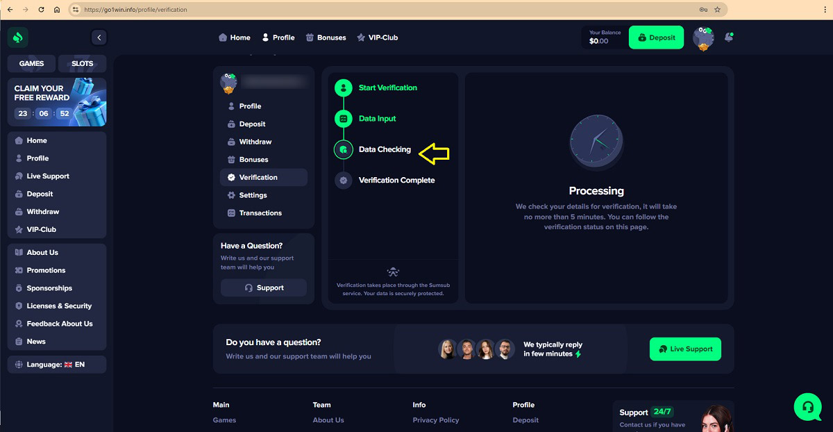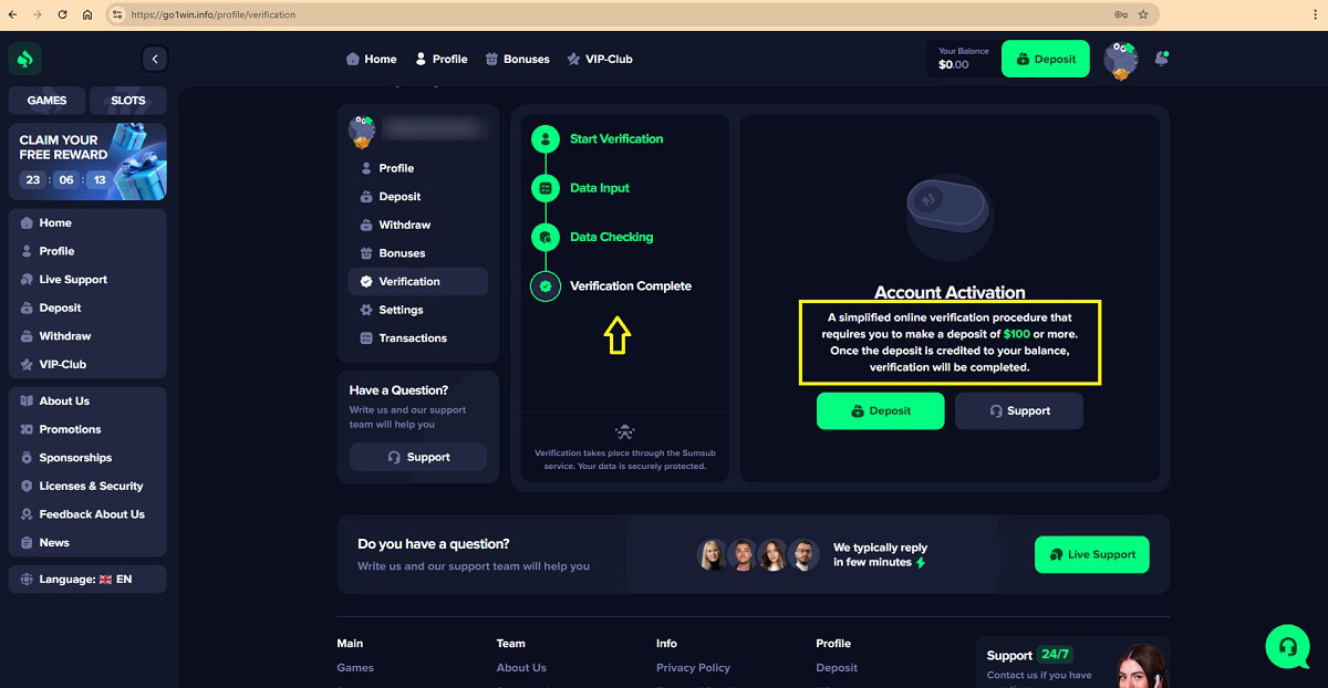The casino’s so-called account verification process follows a pattern commonly used in scam operations. Players are guided through a four-step flow that ends with a demand for money. After entering personal details and waiting for a brief “check,” the site states: