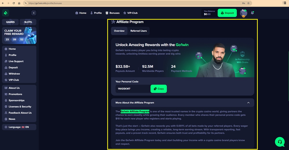 We found no reliable proof that a real Go1win Affiliate Program exists. Public information, industry references, and verified platforms do not support the casino’s affiliate claims. Without documentation or independent confirmation, these offers read as marketing text rather than evidence of a real affiliate program.