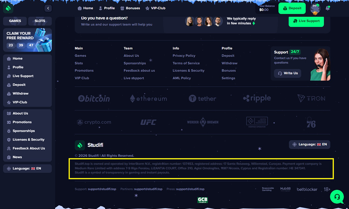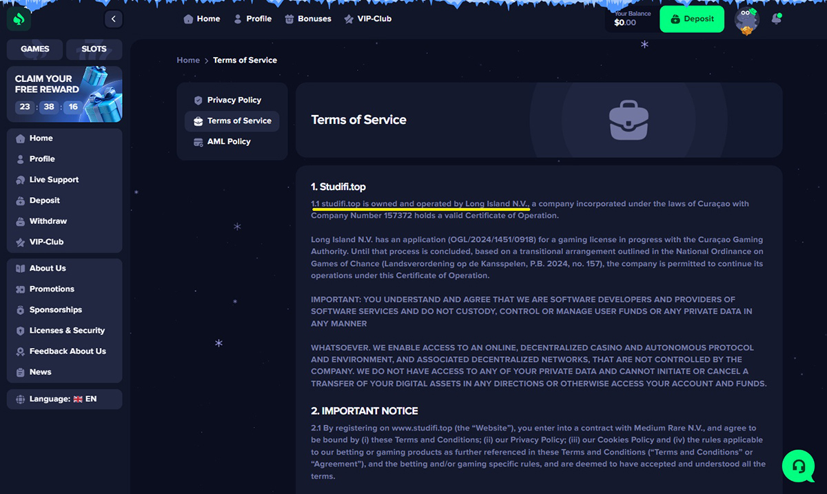 Despite this, Studifi.top continues to present InterStorm (Curaçao) N.V. as its operator. At the same time, the casino’s Terms and Conditions list a completely different company, Medium Rare N.V., as the owner, plus another one, Long Island N.V. These conflicting ownership disclosures further demonstrate the lack of transparency and credibility.