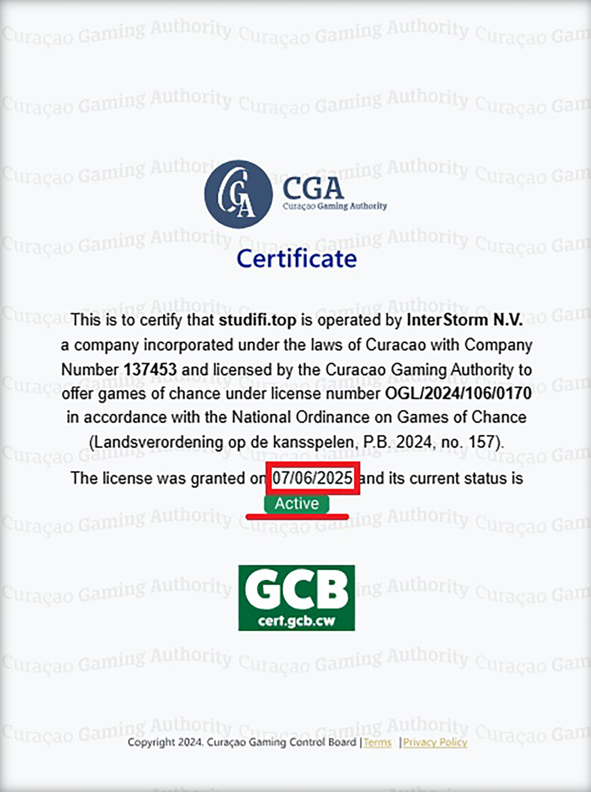 Studifi.top Casino claims to operate under license number OGL/2024/106/0170, allegedly issued to InterStorm (Curaçao) N.V.. However, our findings reveal several critical inconsistencies.