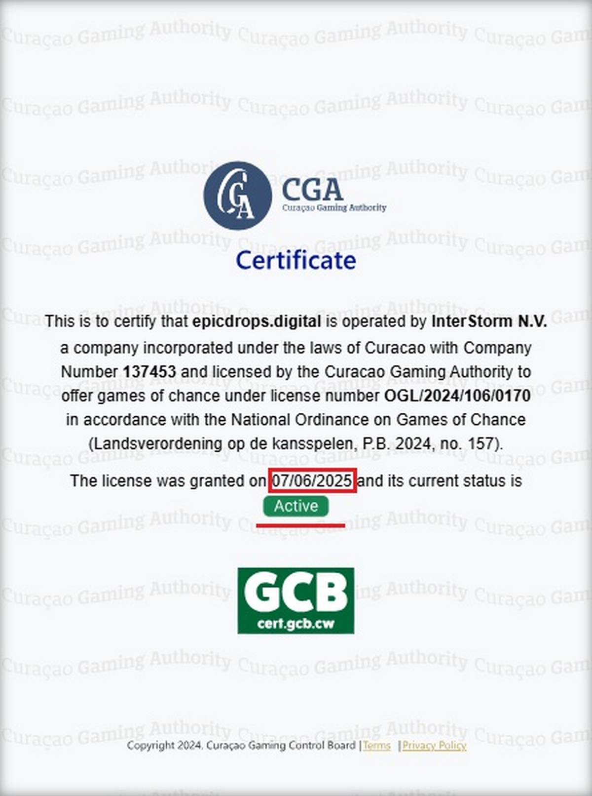 The fraudulent licensing document lists InterStorm (Curaçao) N.V. as the operator and shows license number OGL/2024/106/0170, marked as ACTIVE. However, when cross-referenced against the official Curaçao Gaming Authority registry, the corresponding license was revoked on December 8, 2025, at the operator’s request.