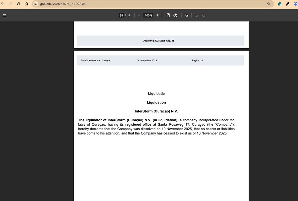Compounding the issue, an official public notice in the Curaçao Gazette confirms that InterStorm (Curaçao) N.V. was dissolved on November 10, 2025 after entering liquidation. The liquidator reported no remaining assets or liabilities, meaning the company no longer exists.