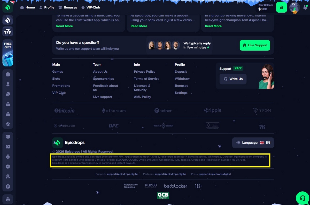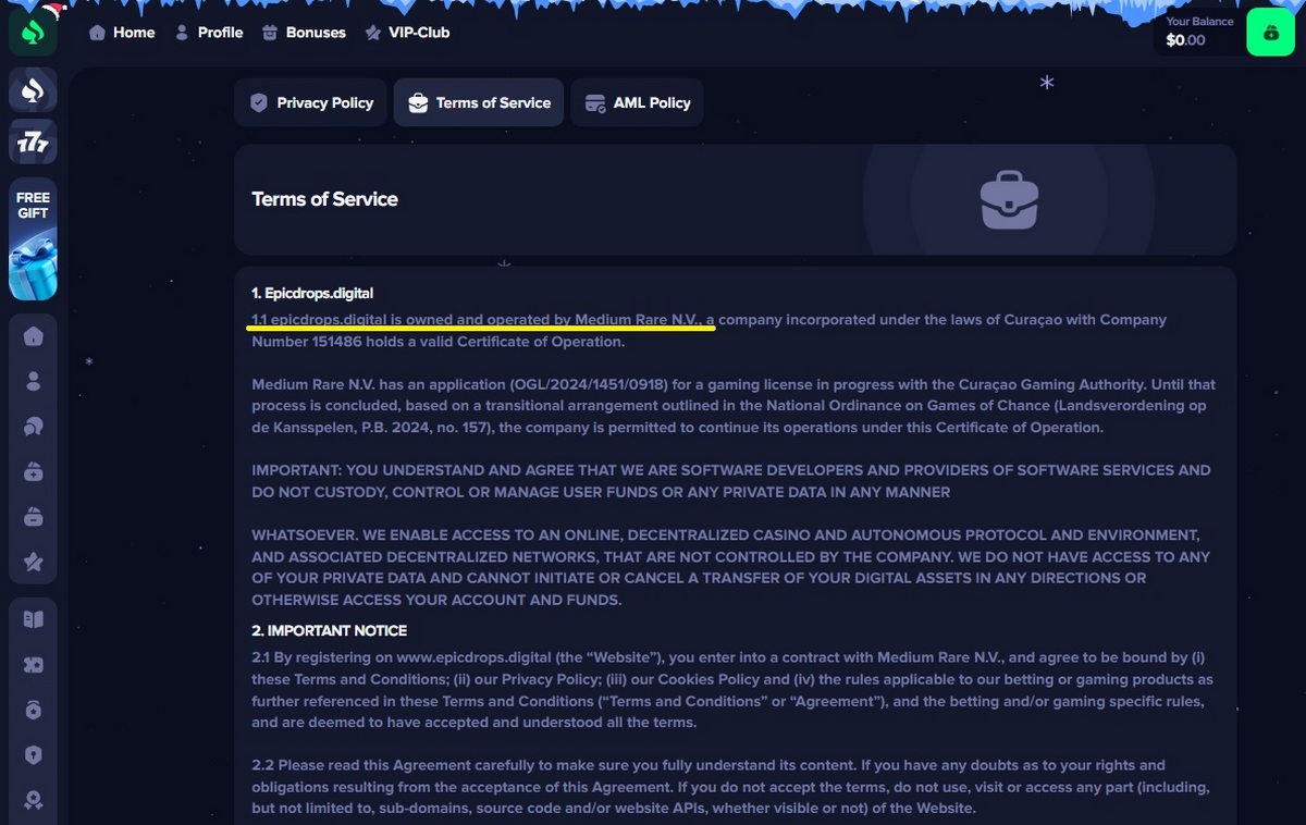 Despite this, Epicdrops.digital continues to present InterStorm as an active regulatory operator, while simultaneously referencing Medium Rare N.V. as the casino owner in its Terms and Conditions. These conflicting disclosures further undermine the casino’s legitimacy and suggest a deliberate attempt to obscure accountability.