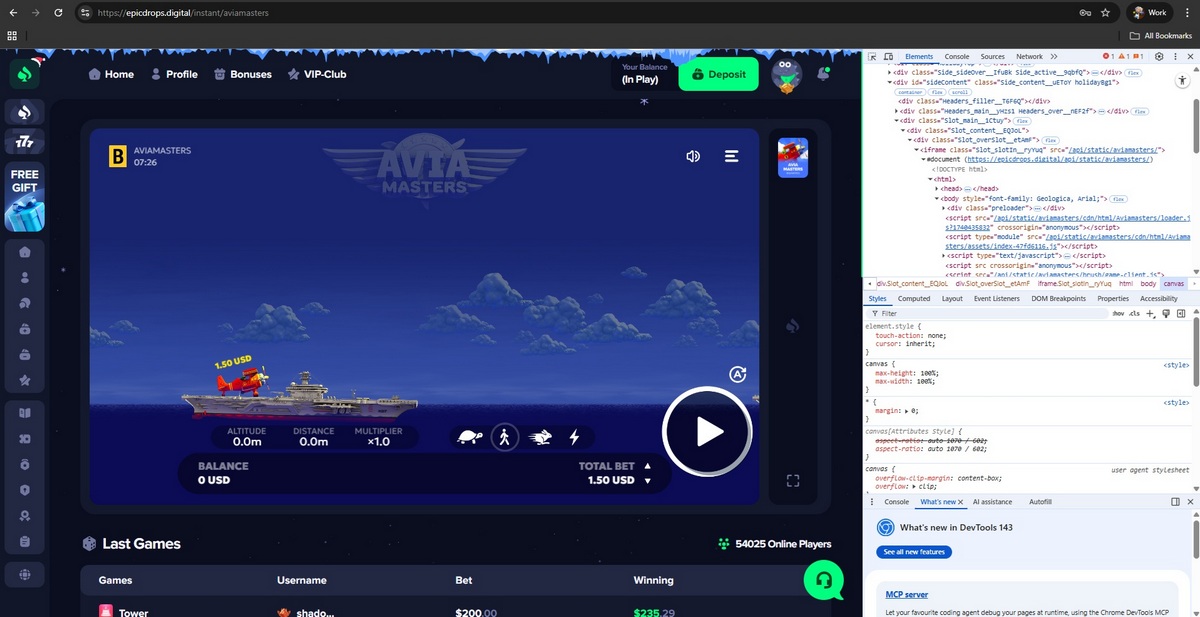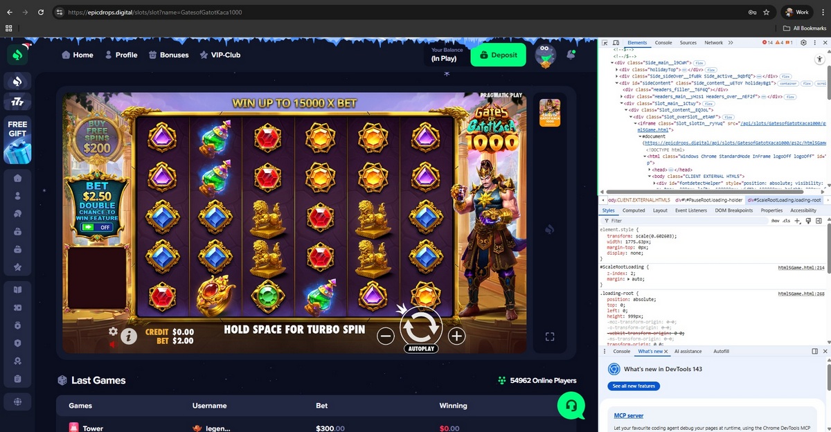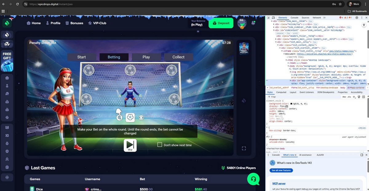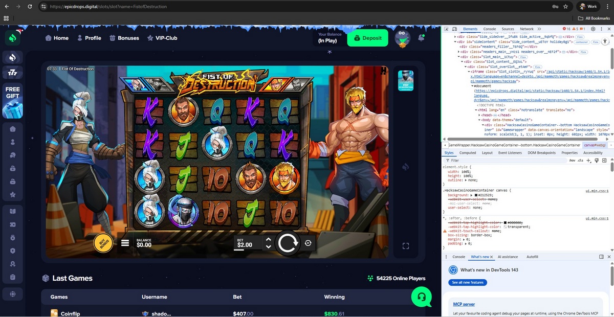 None of these developers supply games to this casino, and no official provider servers are present during gameplay. Instead, games load from infrastructure controlled by the casino itself, indicating that payout logic, RNG behavior, and displayed balances are fully controlled by the operator.