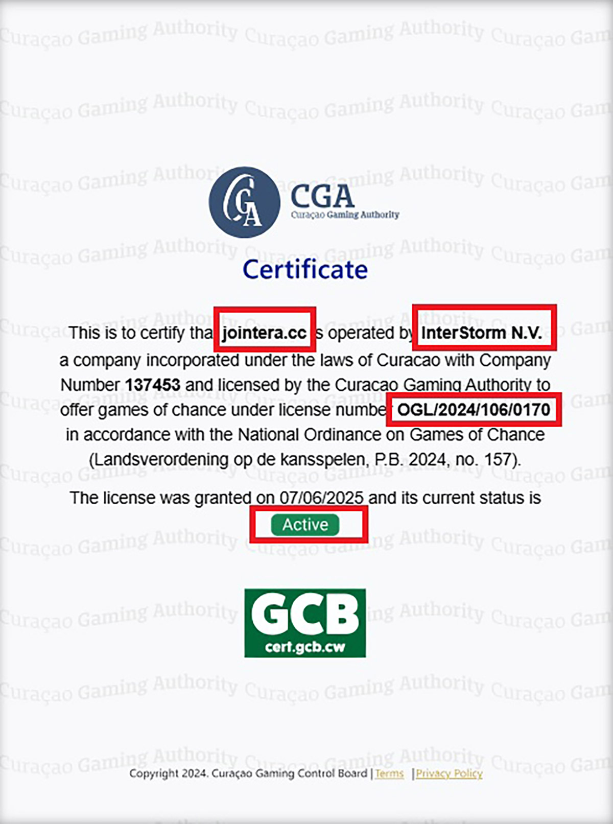 “Long Island N.V. has an application (OGL/2024/1451/0918) for a gaming license in progress with the Curaçao Gaming Authority. Until that process is concluded, based on a transitional arrangement outlined in the National Ordinance on Games of Chance (Landsverordening op de Kansspelen, P.B. 2024, no. 157), the company is permitted to continue its operations under this Certificate of Operation.”