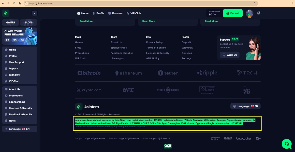 “jointera.cc is owned and operated by InterStorm N.V., registration number: 137453, registered address: 17 Santa Rosaweg, Willemstad, Curaçao. Payment agent company is Medium Rare Limited with address 7-9 Riga Feraiou, LIZANTIA COURT, Office 310, Agioi Omologites, 1087 Nicosia, Cyprus and Registration number: HE 347341.”