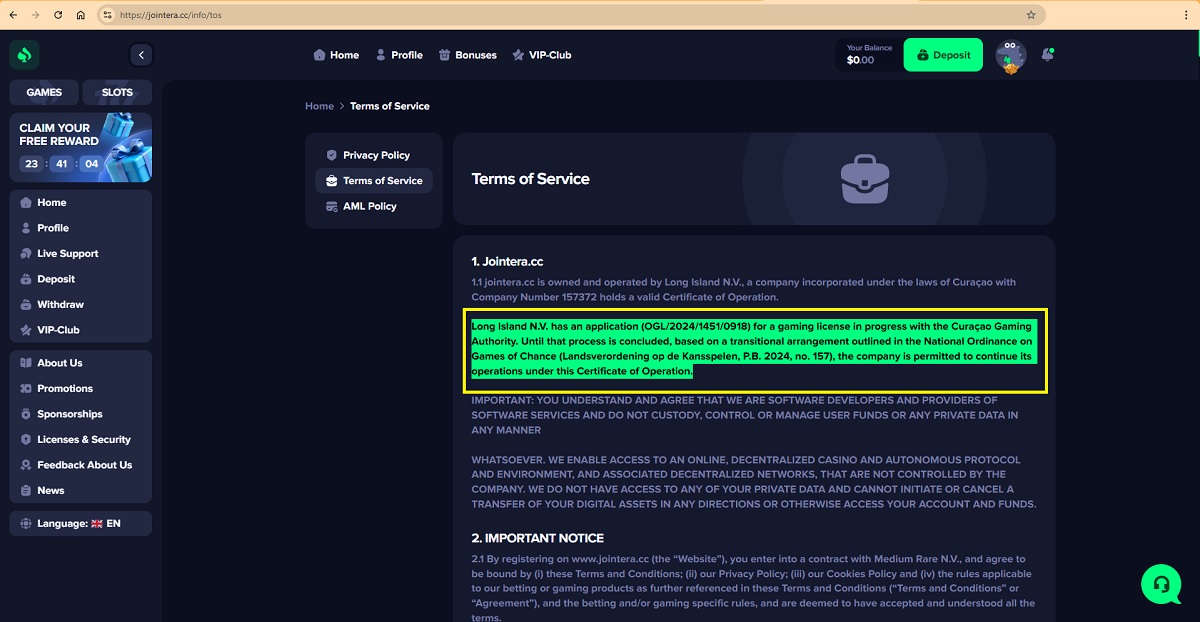 Long Island N.V., named in the Terms and Conditions, presents another problem. While the company was registered in Curaçao in 2021, its registration was discontinued on October 2, 2024. A discontinued company cannot legally operate a casino, yet jointera.cc identifies it as the operator.