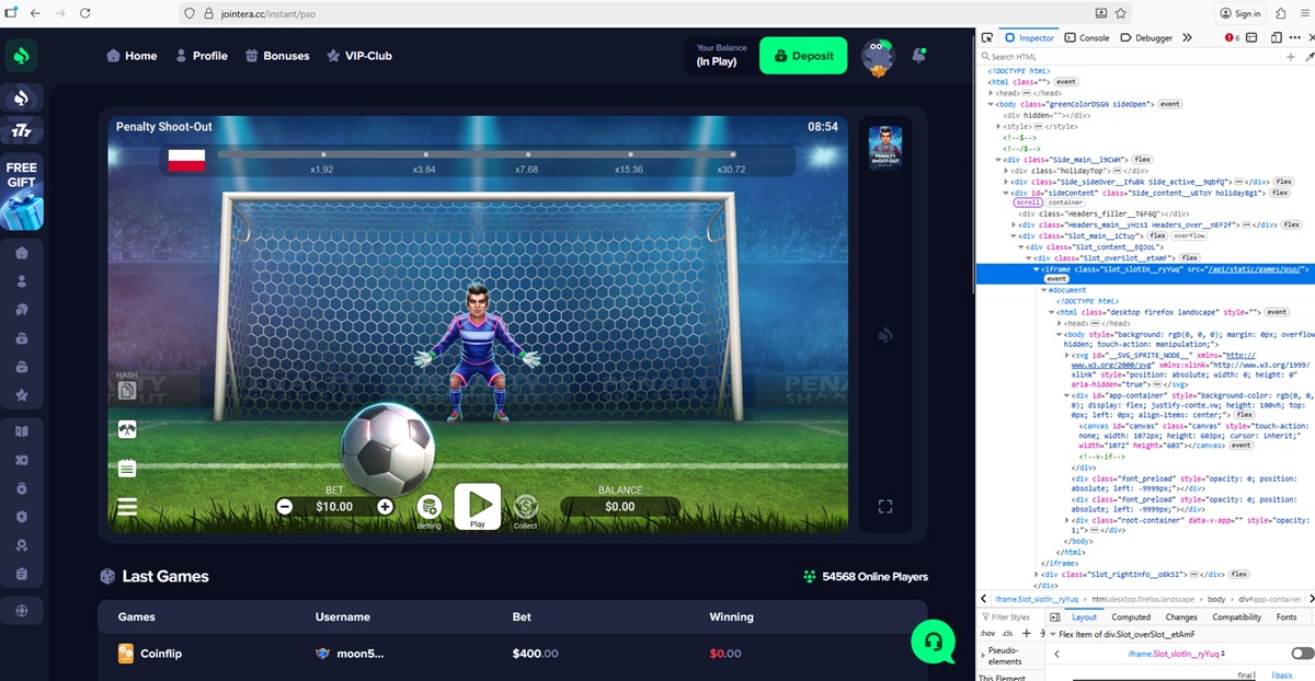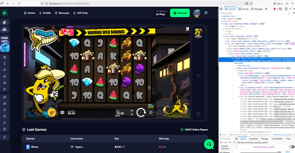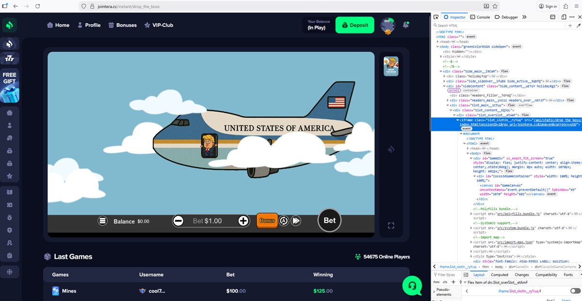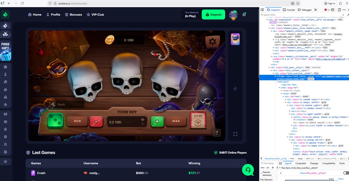 Our technical checks found that jointera.cc uses unauthorized versions of games branded as coming from multiple legit content developers. We detected fake or manipulated games linked to 1Win, Mirror Image Gaming, BGaming, Evoplay, Pragmatic Play, and Hacksaw Gaming.