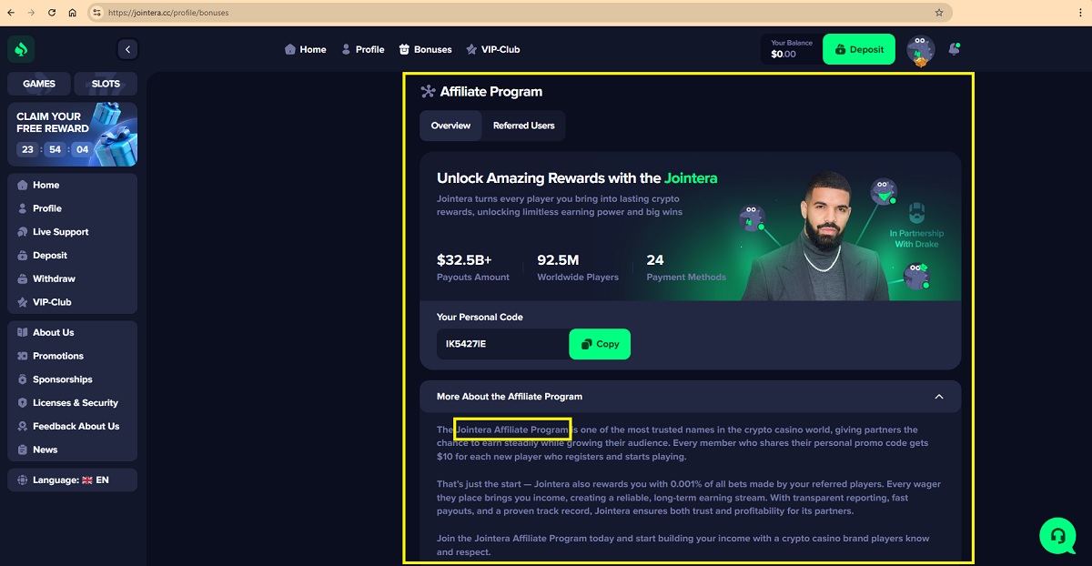 The casino also promotes a Jointera Affiliate Program with promises of fixed payments per player and ongoing revenue shares.