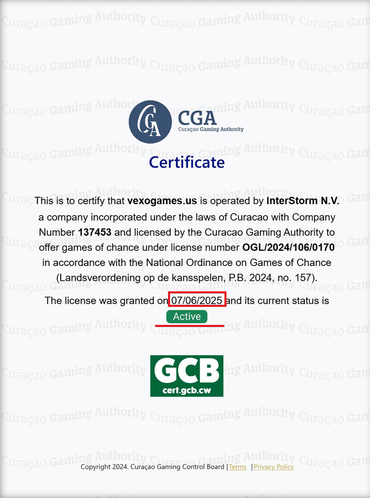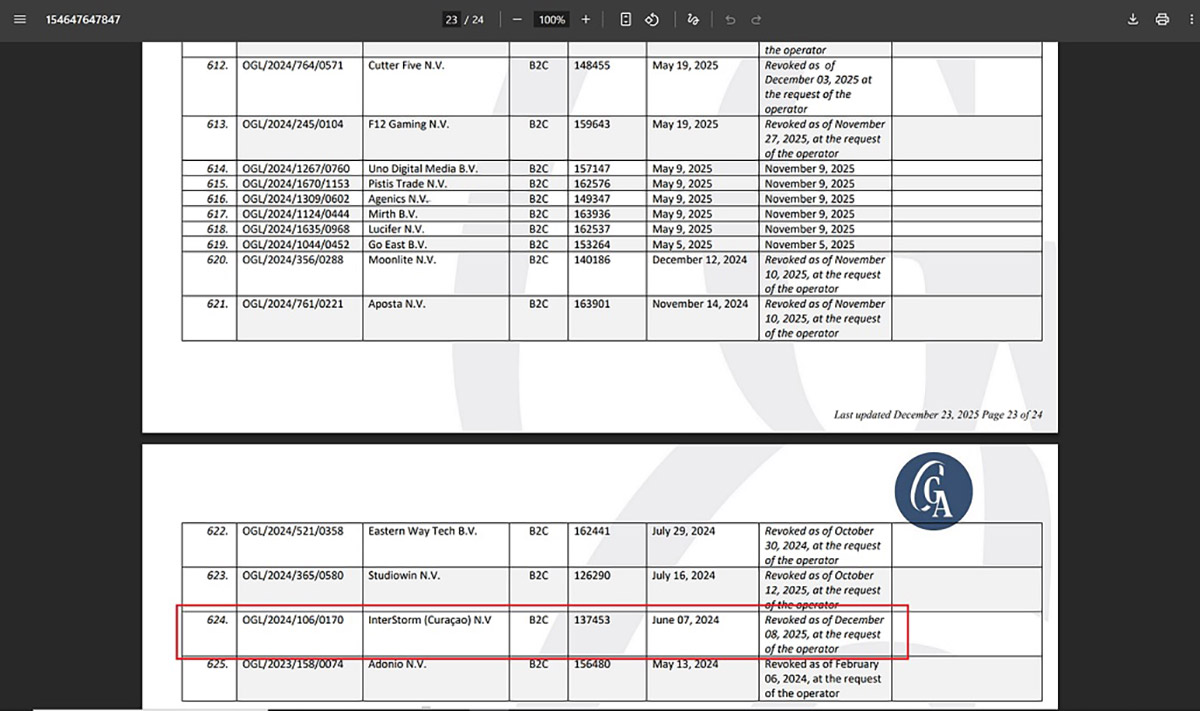 The website displays license number OGL/2024/106/0170 and names InterStorm (Curaçao) N.V. as the licensed operator. Official regulatory records show that this license was revoked on December 8, 2025, at the request of the operator. Despite this, the casino continues to present the license as active on its website.