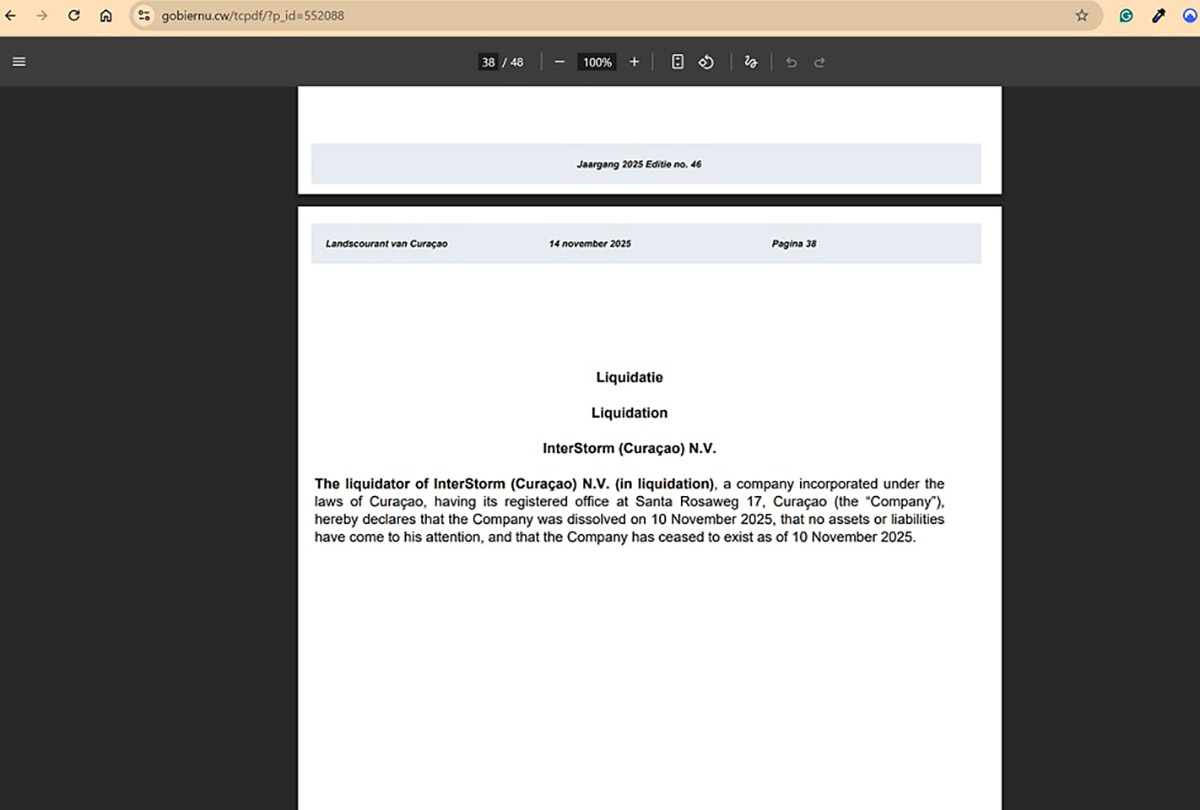 We also reviewed corporate records published in the Curaçao Gazette on the official government website “Gobièrnu di Kòrsou.” An official public notice confirms that InterStorm (Curaçao) N.V. was officially dissolved on November 10, 2025. The notice states that the company entered liquidation and ceased to exist, with no assets or liabilities reported by the liquidator.