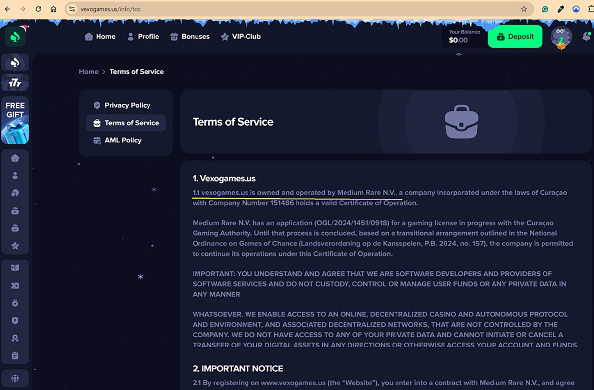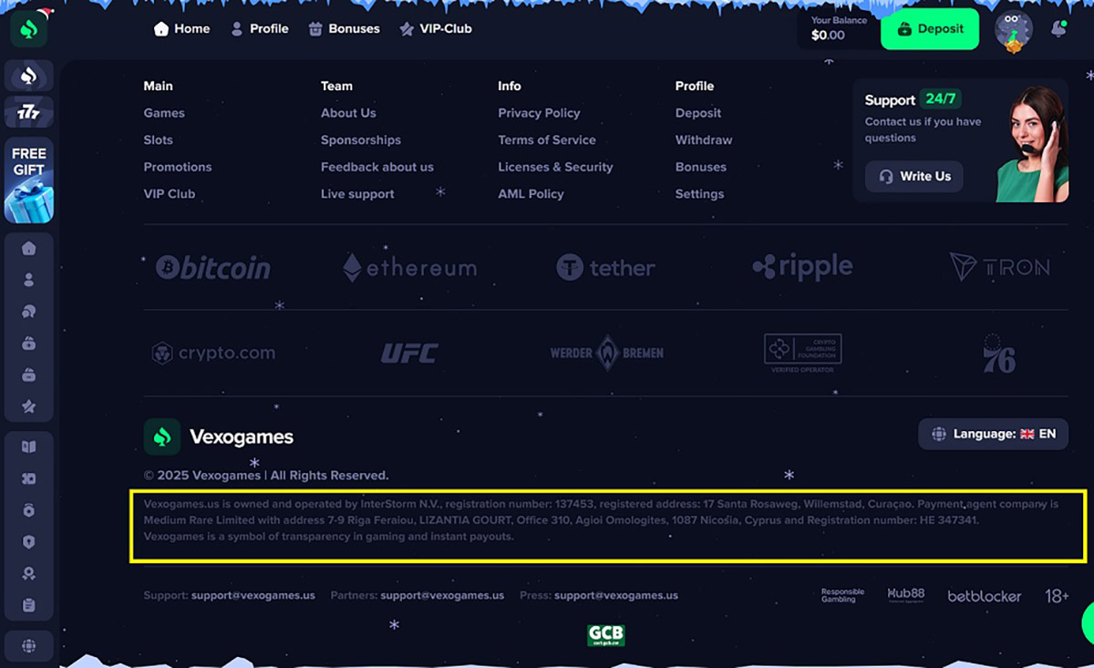 The domain vexogames.us was registered on May 23, 2025. Despite presenting itself as a regulated gambling platform, our checks showed that it operates without a valid gambling license. We also identified the use of fake game software and operating practices that closely match known online casino scams. Due to the number and severity of these issues, we assessed the overall risk level as high.