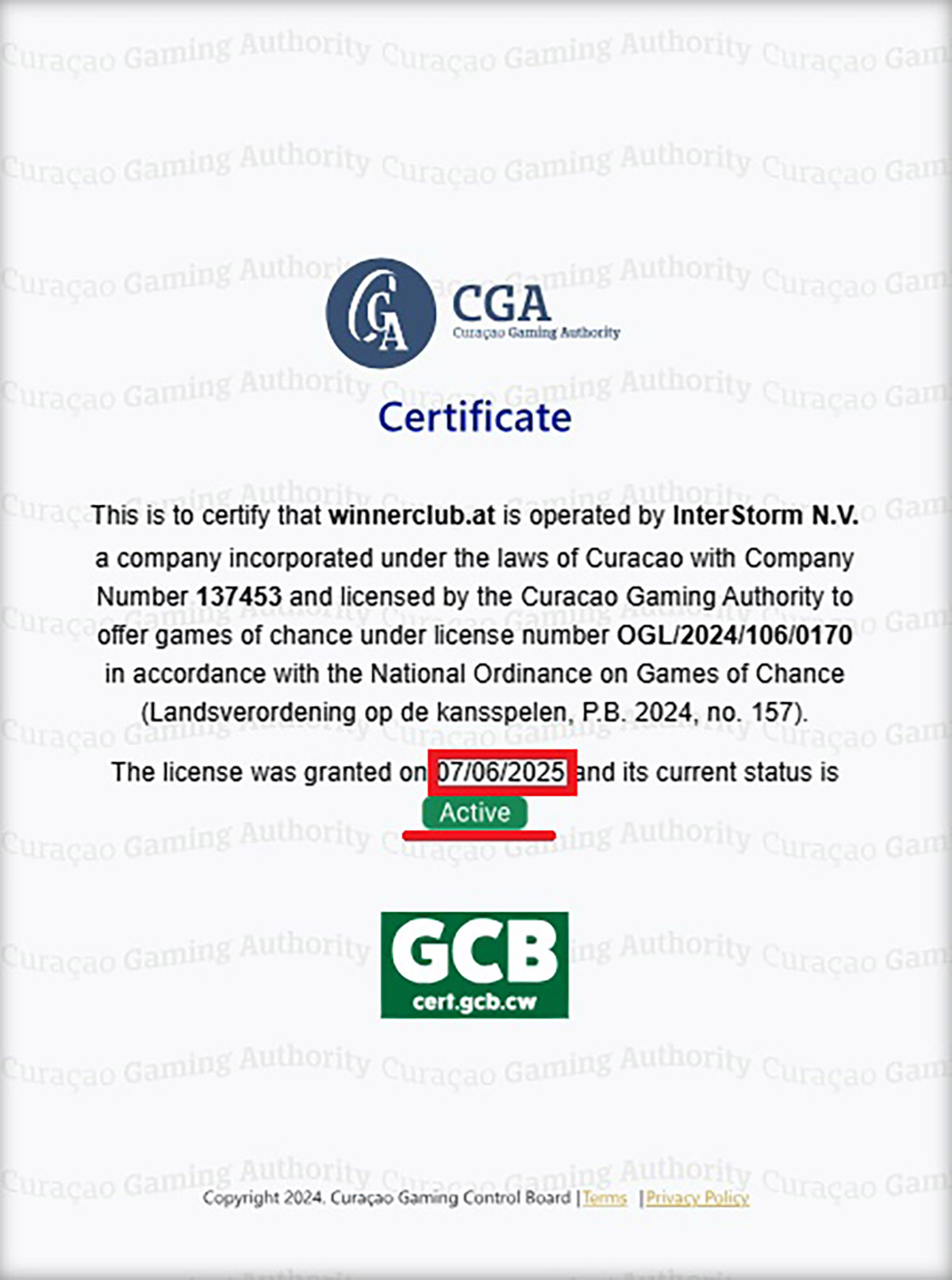 To start with, Winnerclub.at displays license number OGL/2024/106/0170, allegedly issued to InterStorm (Curaçao) N.V., and marks it as active, which is factually incorrect.