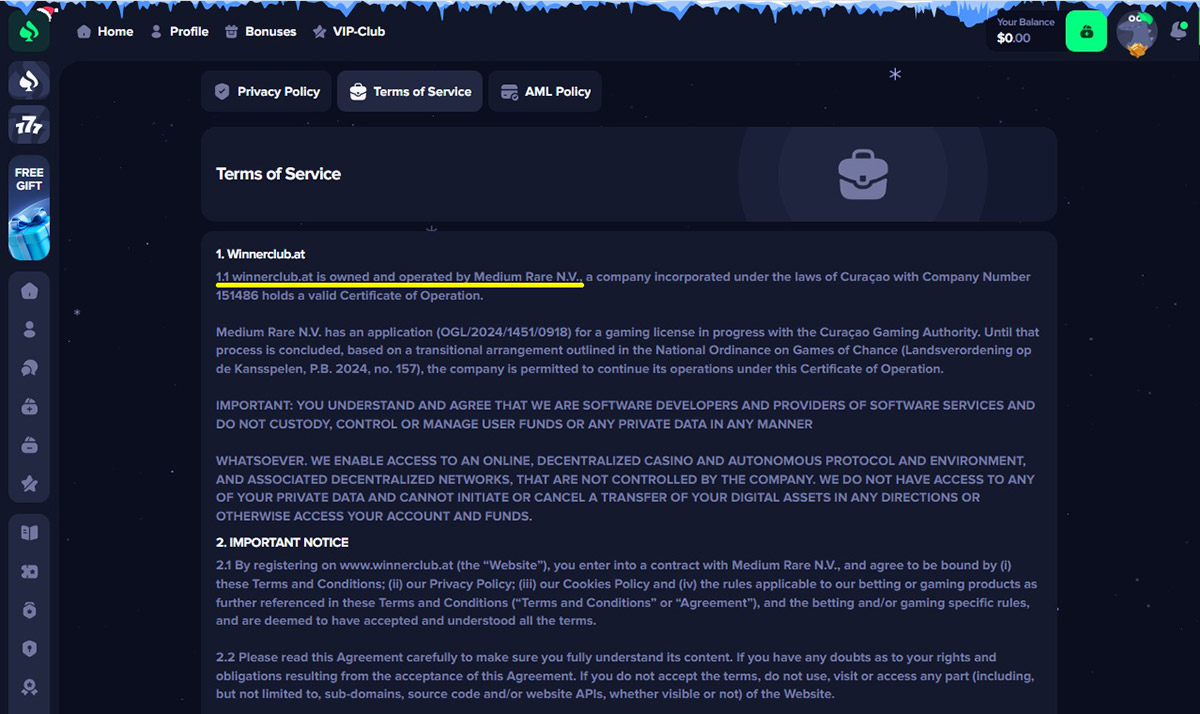 Despite this, Winnerclub.at continues to name InterStorm (Curaçao) N.V. as its operator in the website footer and licensing pages. At the same time, the casino’s Terms and Conditions identify Medium Rare N.V. as the owner. Such inconsistencies raise serious concerns about the casino’s transparency and trustworthiness.