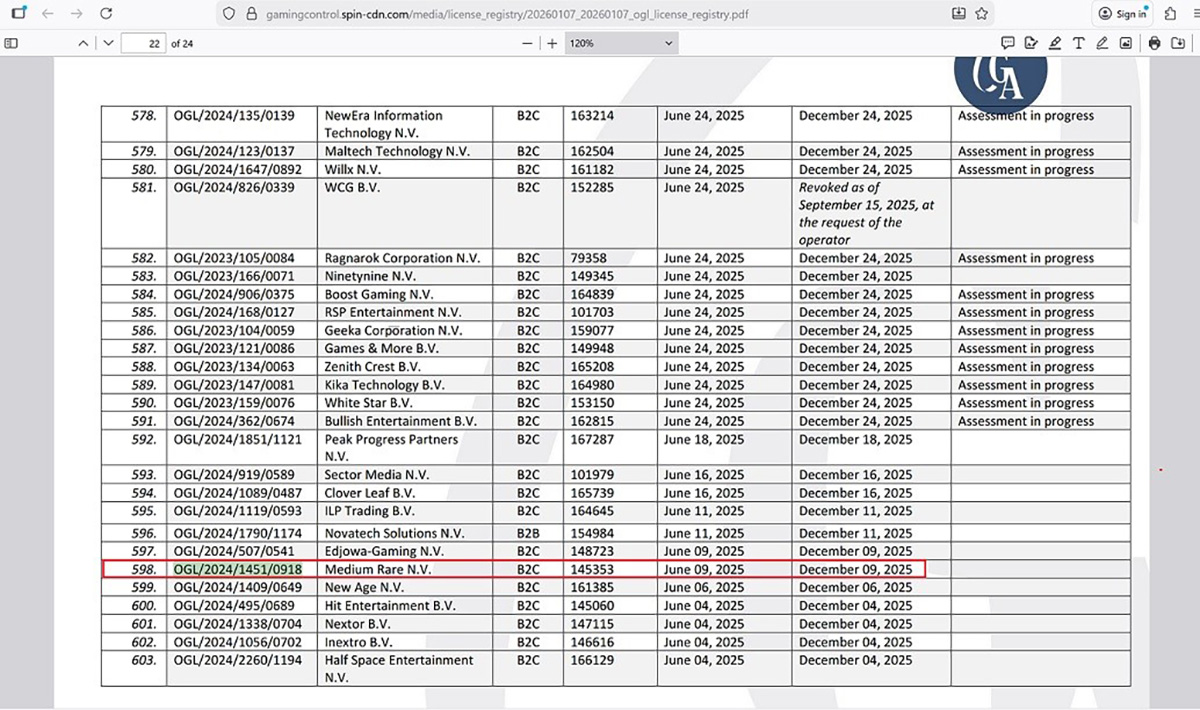 What raises additional concern is how the casino presents its licensing information. The license number referenced on the website, OGL/2024/1451/0918, is officially registered to a different company, Medium Rare N.V., and expired on December 9, 2025.