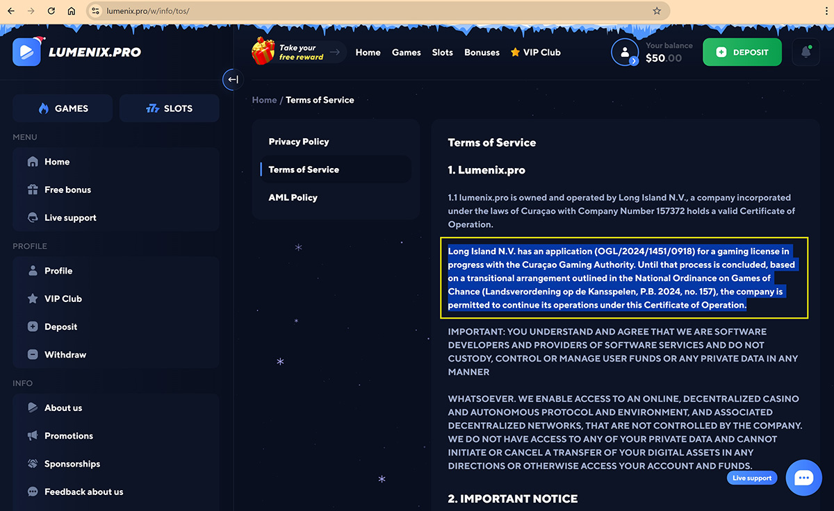 “Long Island N.V. has an application (OGL/2024/1451/0918) for a gaming license in progress with the Curaçao Gaming Authority. Until that process is concluded, based on a transitional arrangement outlined in the National Ordinance on Games of Chance (Landsverordening op de Kansspelen, P.B. 2024, no. 157), the company is permitted to continue its operations under this Certificate of Operation.”