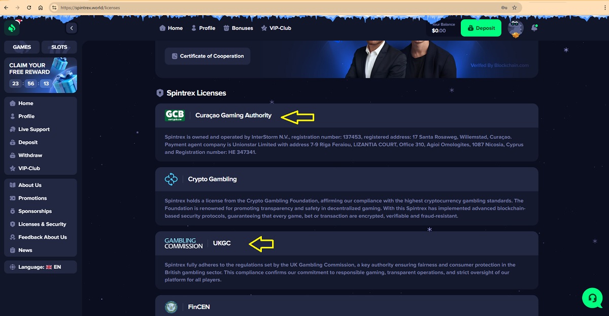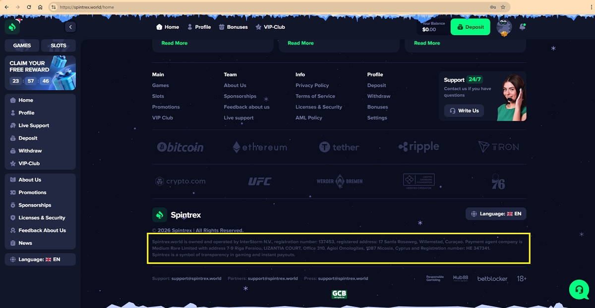 Spintrex.world presents itself as a licensed casino and lists both the Curaçao Gaming Authority and the UK Gambling Commission as regulators. We checked these claims carefully.