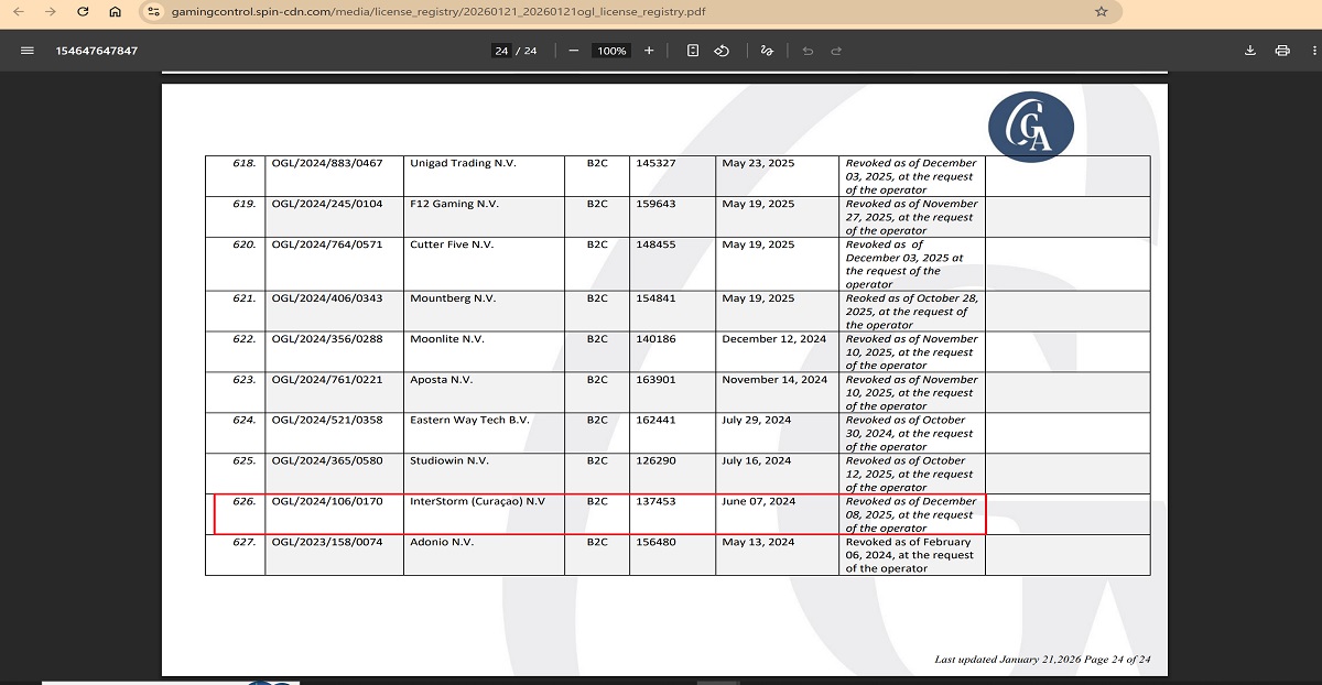 Official Curaçao Gaming Authority records show otherwise. That license was revoked on December 8, 2025, at the request of the operator.