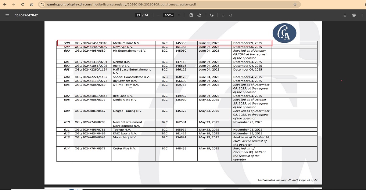 The Terms and Conditions introduce another company, Medium Rare N.V., and refer to a different license application, OGL/2024/1451/0918. According to official records, this license belonged to Medium Rare N.V., was issued on June 9, 2025, and expired on December 9, 2025. It is no longer valid.