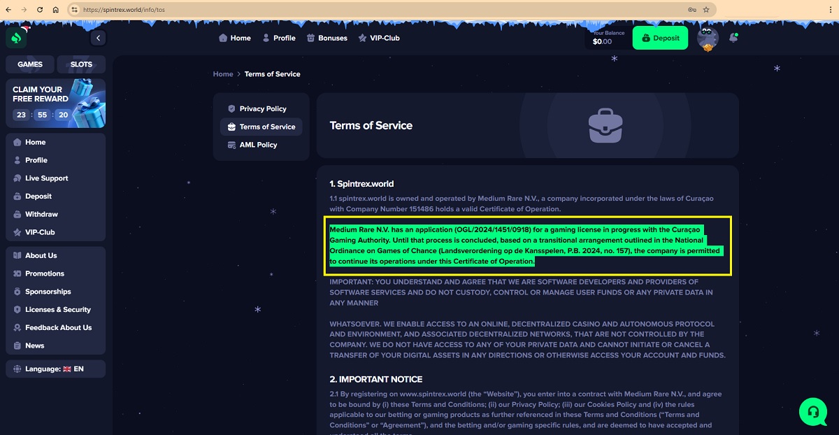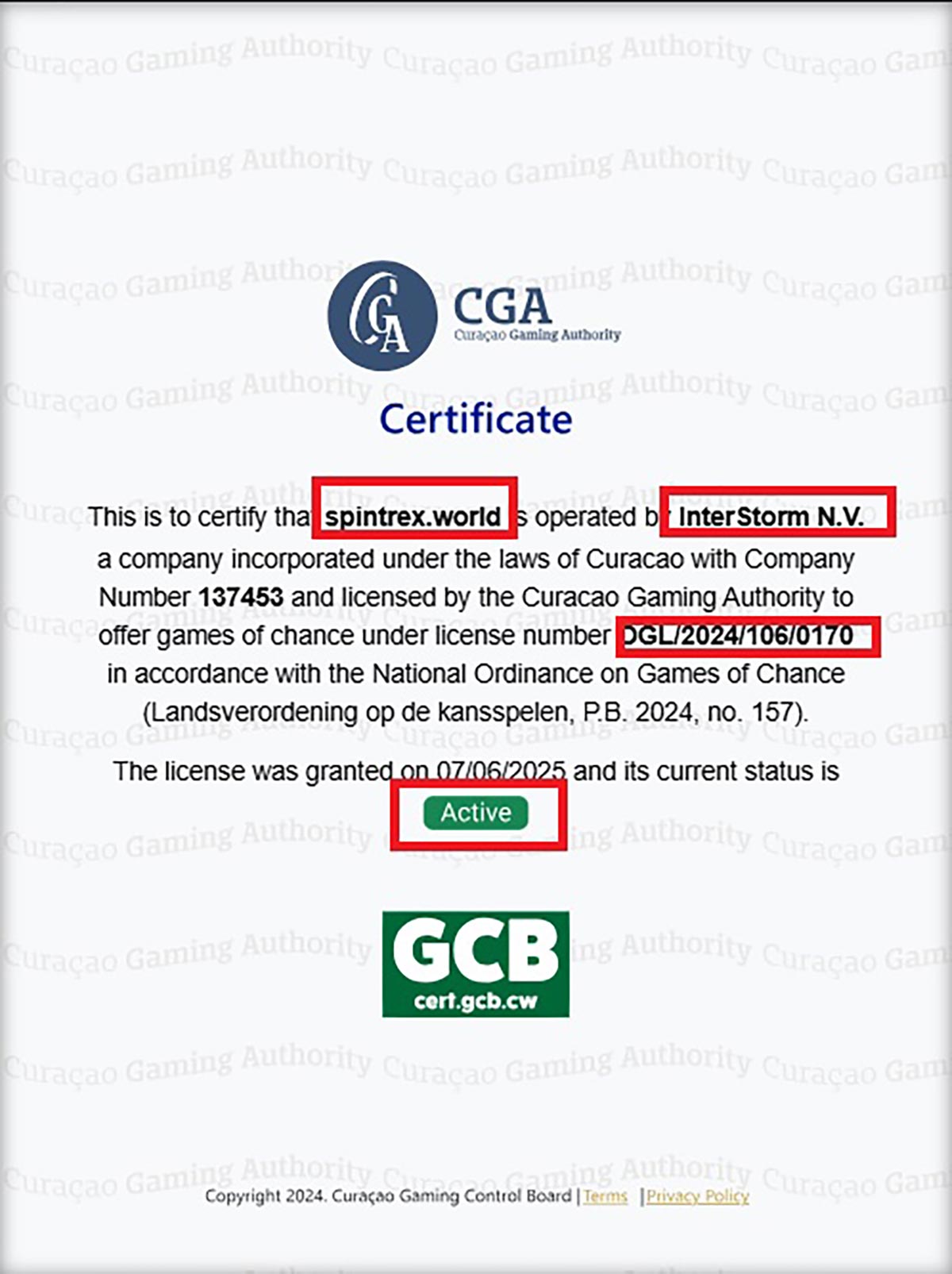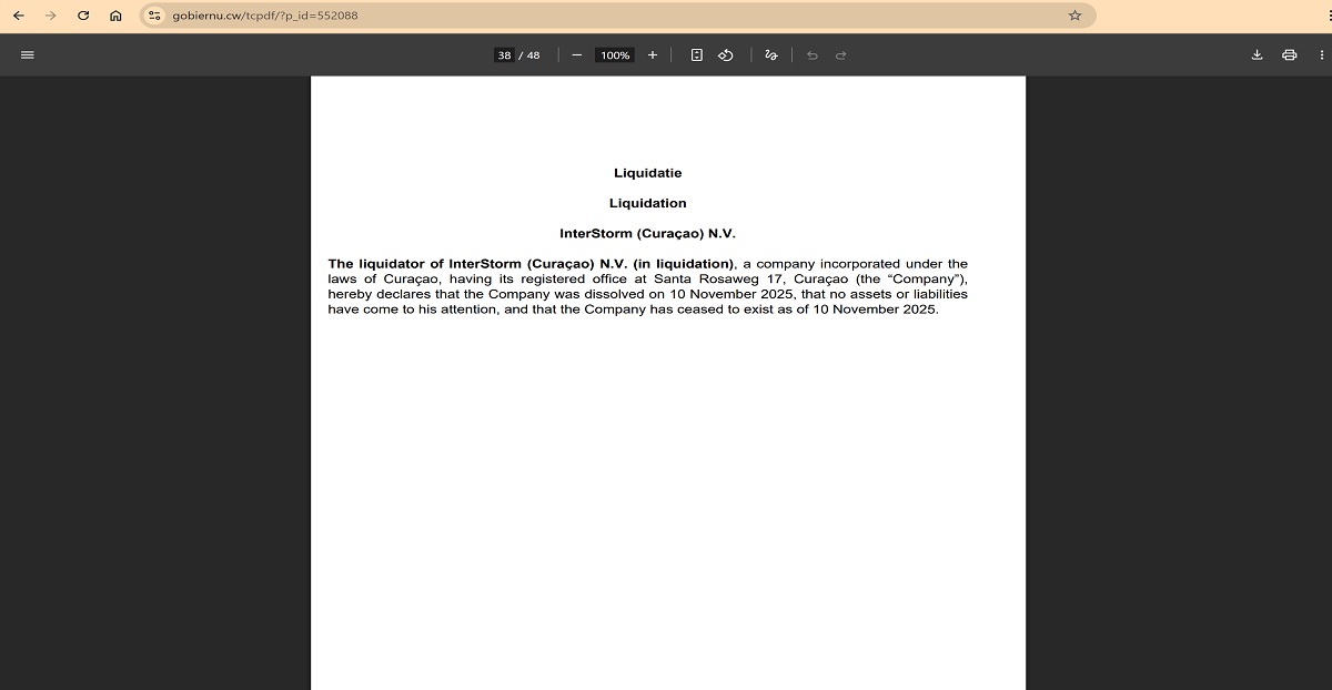 Our checks into company ownership uncovered another major red flag. InterStorm (Curaçao) N.V., which spintrex.world lists as its owner, was officially dissolved on 10 November 2025. This was confirmed through a public notice published in the Curaçao Gazette by the Government of Curaçao.