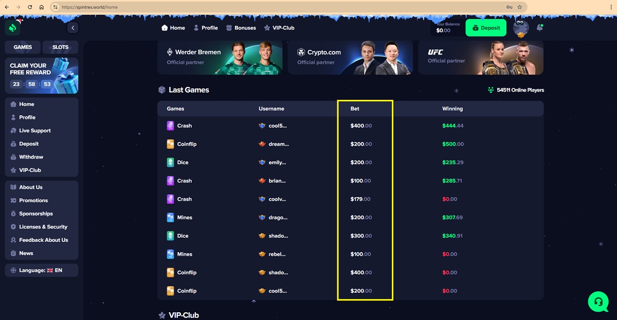 In addition, the website displays a live feed of recent bets and wins that shows unusually large wagers and frequent high payouts. The scale and consistency of these figures do not reflect realistic player activity and suggest simulated data designed to create a false impression of success.
