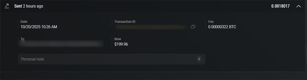 - Withdrawal of 0.00405064 BTC requested on October 20, 2025.