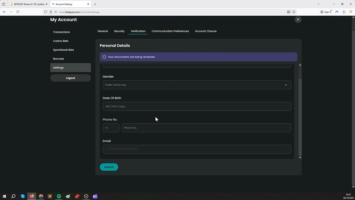 While waiting for his deposit to arrive in his account, Red Apple decided to verify his account by providing full name, gender, date of birth, phone number, email address and a scanned copy of his ID. As soon as he submitted the information, he was notified that the documents are being reviewed.