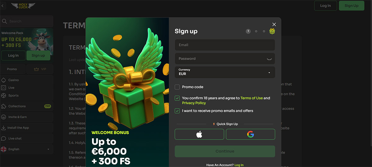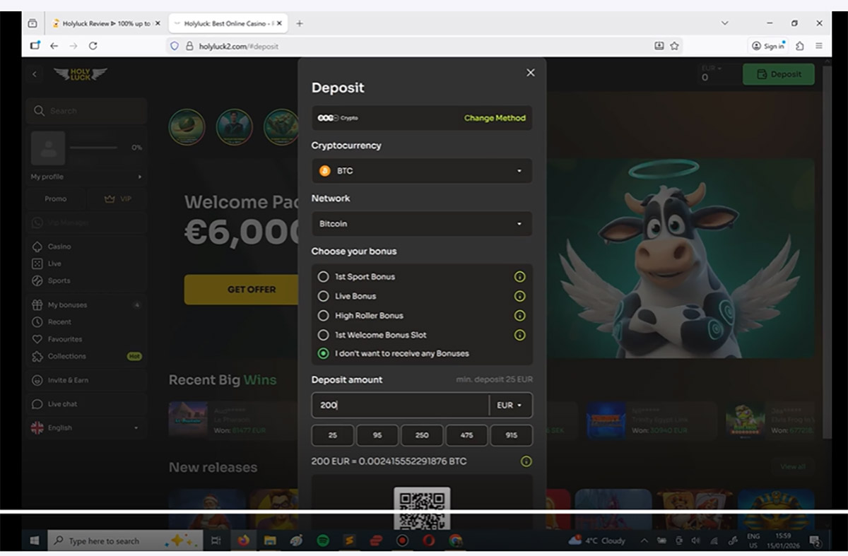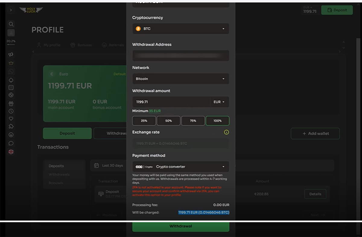 Curious to see how unlicensed Holyluck Casino handles this payment option, we delegated a tester to investigate it. He went through the standard procedure, from registration to withdrawal, walking away with a considerable amount of money.
