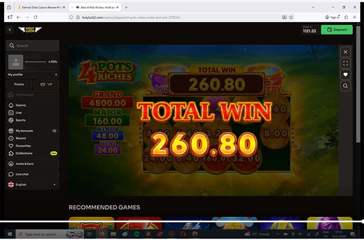 He then played 3 Chillies and Joker, and 3 Pots Riches Extra, the latter of which was marked with two significant wins, one of EUR 64.64 and the other of EUR 59.20. The tester then played 4 Pots Riches, landing another fantastic win of EUR 260.80.
