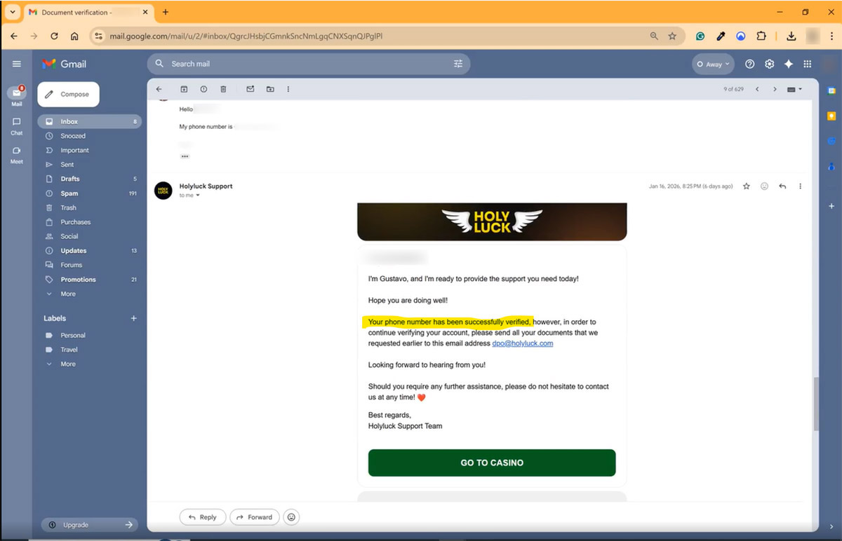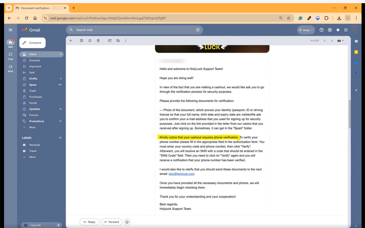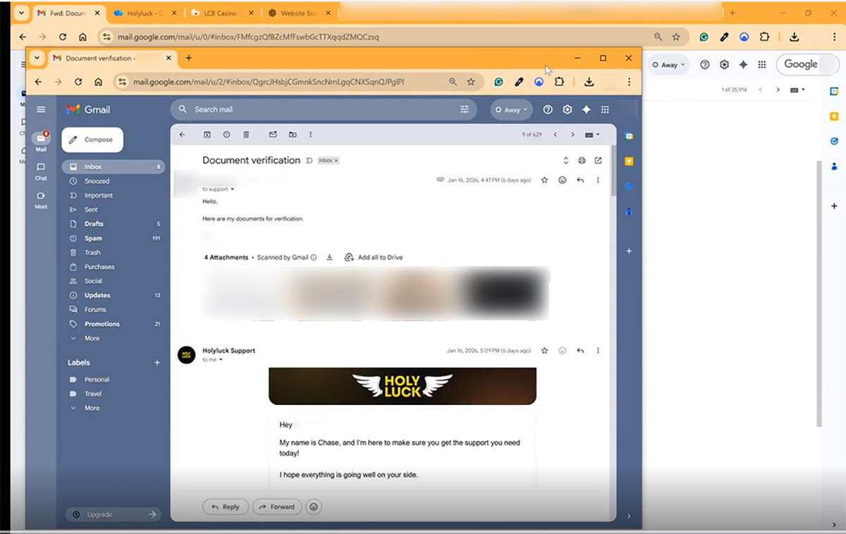 Following quite a fulfilling gaming session, the tester went on to cash out. But before that, he made sure to verify his identity by sending an image of the passport, utility bill, selfie with a document, and proof of deposit, all via mail.