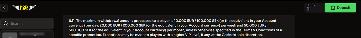 “6.14. If you win more than 50,000 EUR / 500,000 SEK (or the equivalent in your Account currency), Holyluck reserves the right to divide the payout into monthly installments of a maximum of 50,000 EUR / 500,000 SEK (or the equivalent in your Account currency) until the full amount is paid out. All progressive jackpot wins will be paid in full.”