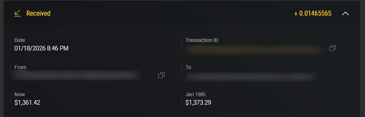The money arrived faster than noted, on January 18, 2026. The tester received $1,373.29/ 0.01465565 BTC.