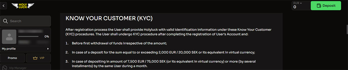 “10. […] Please note that Holyluck can request you to undergo detailed KYC procedure under the present Policy before your first deposit that is lower than €2,000 or its equivalent if such requirement is essential for processing payments through certain payment providers/institutions/banks.”