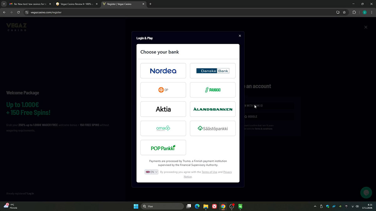 The tester set off on his adventure on January 17, 2026 by loading up the casino’s website. Given that he was given an option to log in with Bank ID, he decided to go for it, looking to get into the action right away.