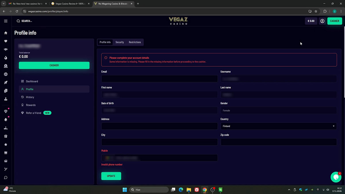 Having successfully logged in, our tester visited his profile where he found out that some information was missing and that he needs to fill in the missing information before proceeding to the cashier.