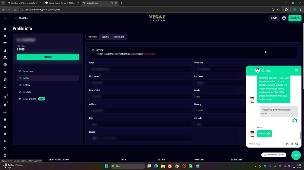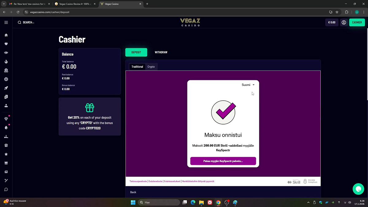 - Deposit of €200 via Skrill made on January 17, 2026. Within moments the tester’s casino balance was updated to €200
