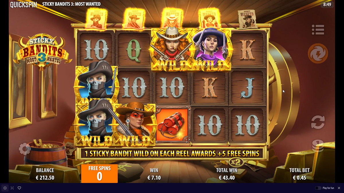 Next in line was Sticky Bandits 3: Most Wanted, a western-themed slot by Quickspin. The luck was on our tester’s side and just a few spins in he managed to trigger the free spins feature, rewarding him with a total win of €43.40.