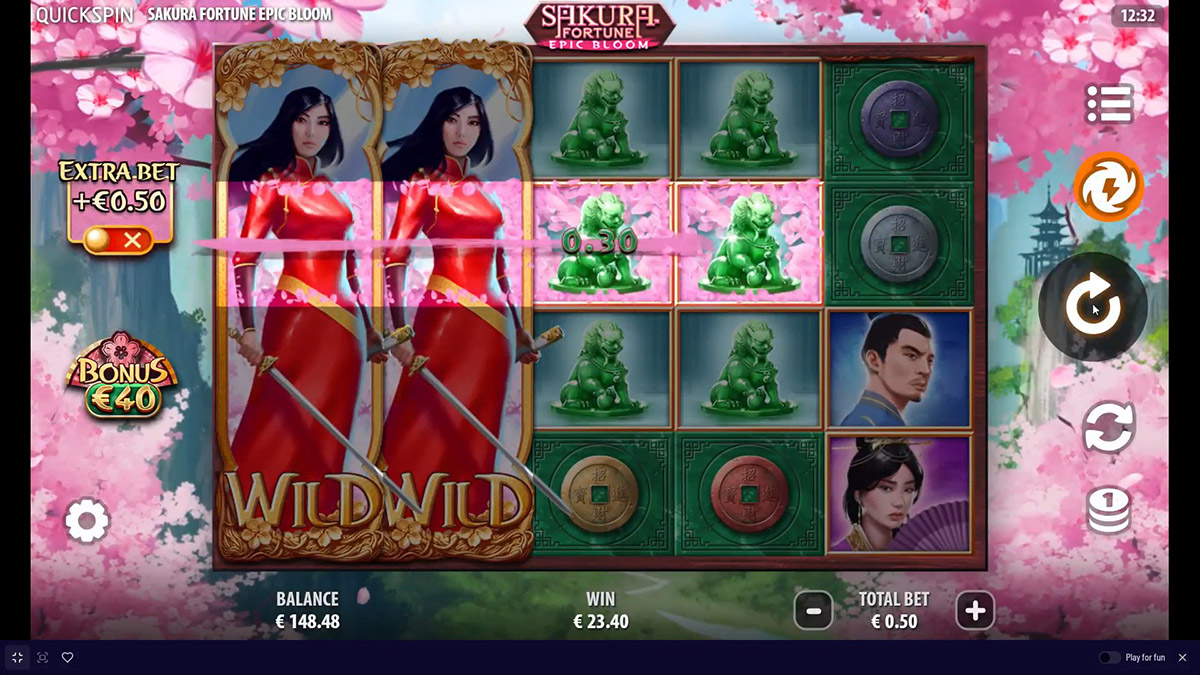 After checking out a handful of different slots, it seemed as if the tester’s luck had run out, until he loaded Sakura Fortune Epic Bloom that is. Here the tester managed to land a hefty win of €23.40 and turn his luck around.