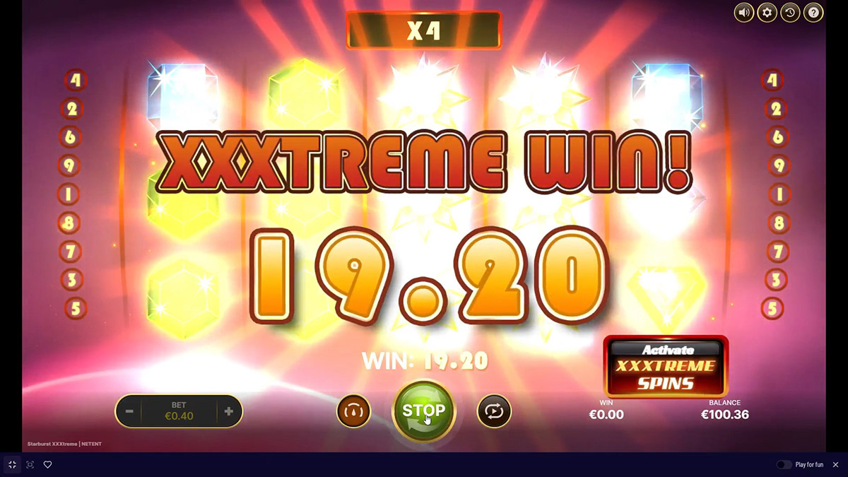 Once again the tester seemed to have run into a losing streak, before scoring an xxxtreme win of €19.20 in Starburst XXXtreme.