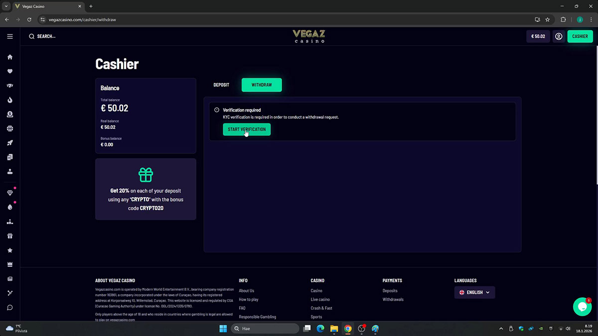 With €50.02 available in his account balance, it was time for our tester to check out the withdrawal processing time. However, when he tried to start the withdrawal process, he found out he had to go through the KYC verification to request a withdrawal.