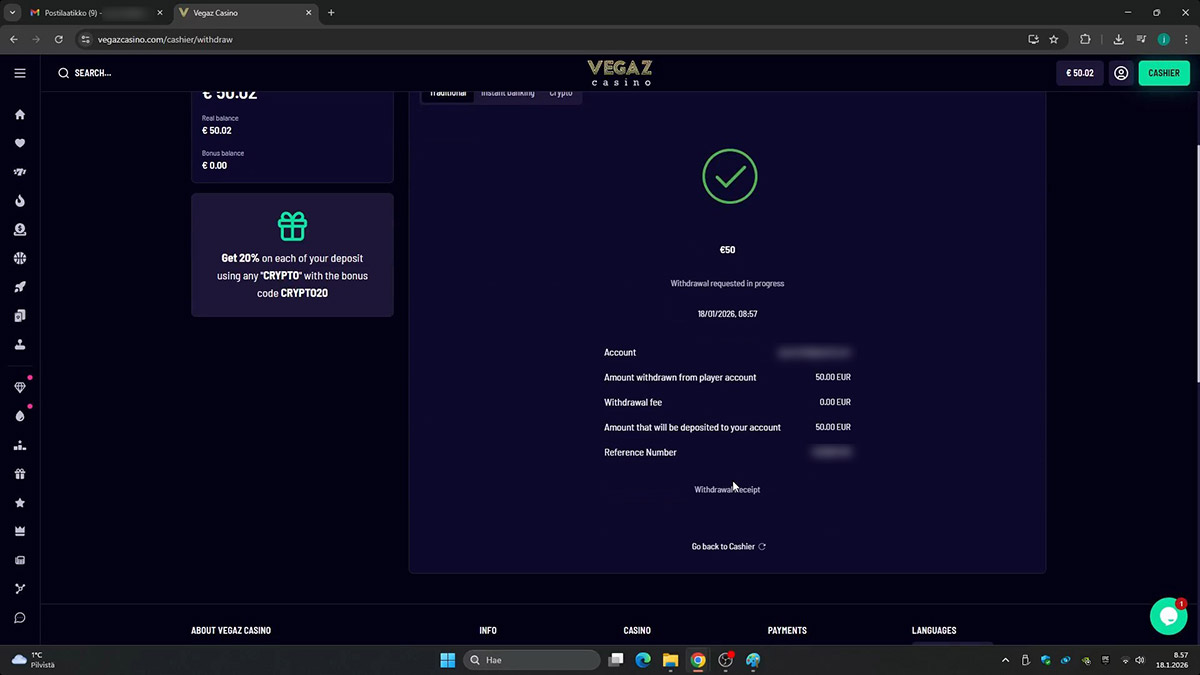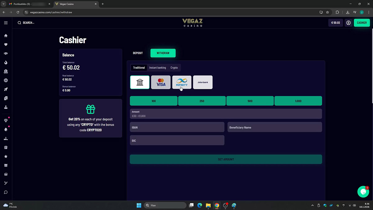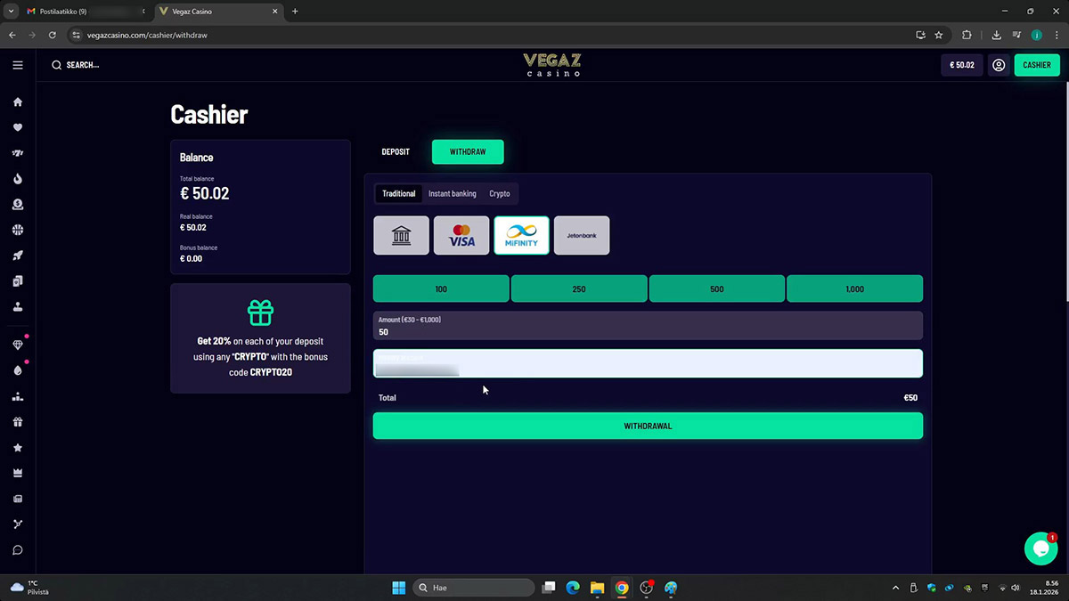 Since Skrill wasn’t among the banking options that can be used for withdrawal, the tester decided to go with Mifinity instead. He submitted a withdrawal request of €50 on January 18, 2026.