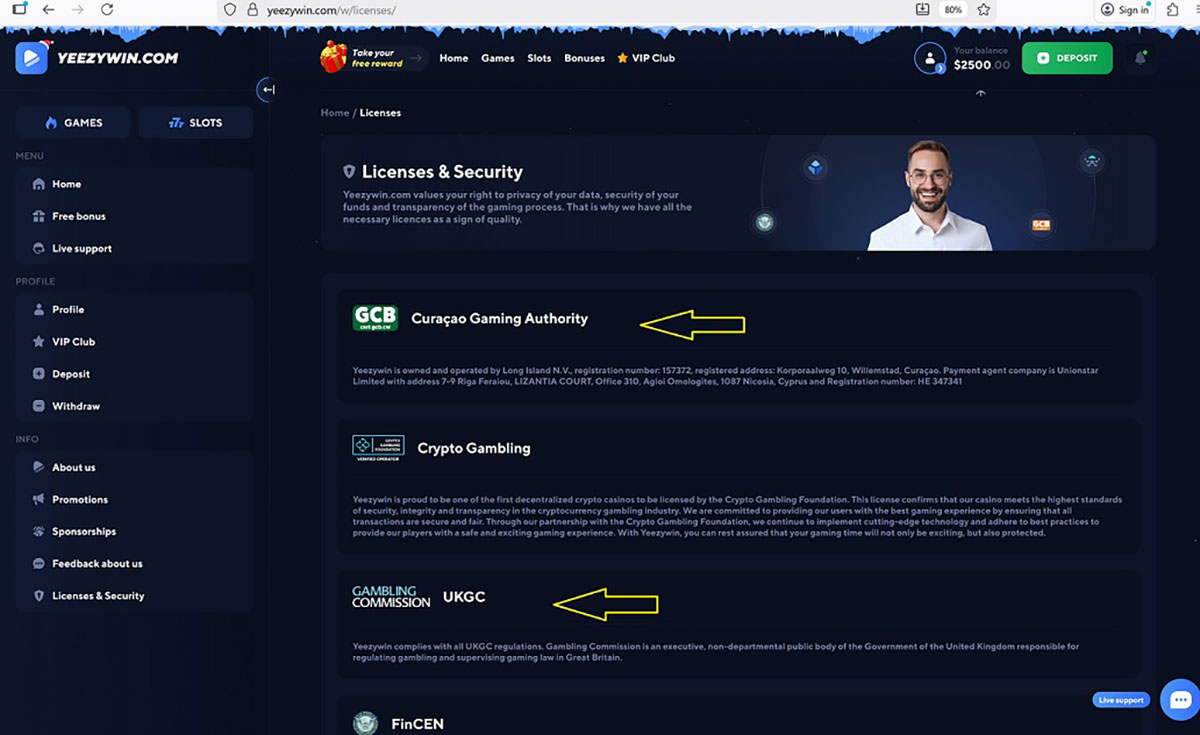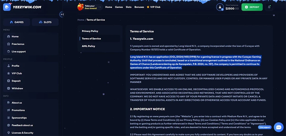 Yeezywin Casino presents Long Island N.V. as the company behind the operation and claims that the entity has a gaming license application in progress. The casino references the Curaçao Gaming Authority and the UK Gambling Commission in its text and visual elements. These claims do not hold up under verification.
